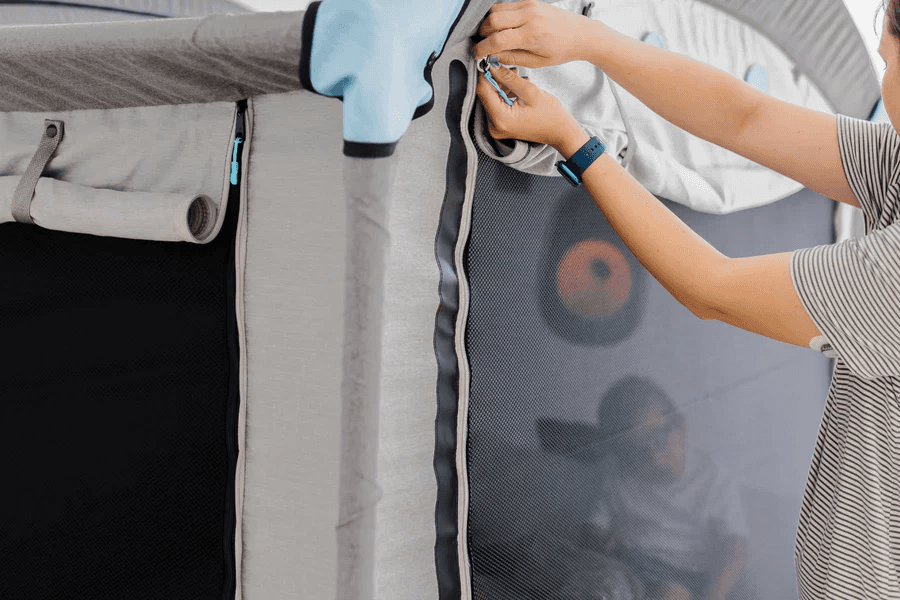 Dual-layer mesh + fabric doors provide protection against wandering and falls. Each entrance has a safety pocket + clasp that hide and secure the interior zipper to ensure a safe night’s sleep. The canopy is stretched tightly, creating 360 degrees of protection to guard against injury, while Safety Sheets zip and lock to the interior walls to guard against entrapment and burrowing.